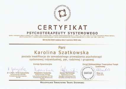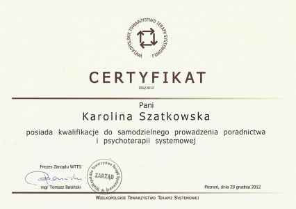 - Certyfikat Psychoterapeuty Systemowego, Wielkopolskie Towarzystwo Terapii Systemowej