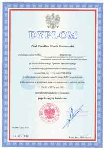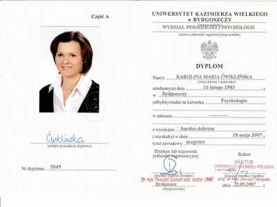 - magister psychologii, Uniwersytet Kazimierza Wielkiego w Bydgoszczy