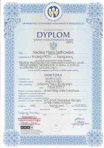- doktor nauk społecznych w dyscyplinie psychologia, Uniwersytet Kazimierza Wielkiego w Bydgoszczy