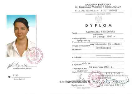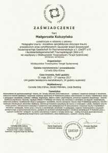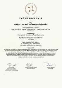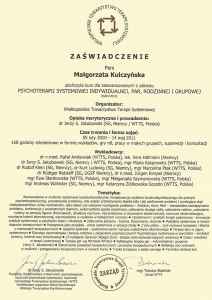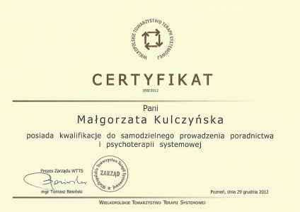 - Certyfikat Psychoterapeuty i Doradcy Systemowego Wielkopolskiego Towarzystwa Terapii Systemowej (WTTS jest placówką atestowaną przez Sekcję Naukową Psychoterapii Polskiego Towarzystwa Psychiatrycznego)