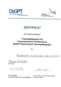 - Certyfikat Specjalisty ds. Psychotraumatologii i Pedagogiki Traumy (szkolenie z zakresu pedagogiki traumy / doradztwa specjalistycznego w zakresie traumy, realizowane zgodnie z wytycznymi Deutschsprachige Gesellschaft für Psychotraumatologie e.V. (DeGPT e.V) i Bundesarbeitsgemeinschaft Traumapädagogik (BAG e.V) przy współpracy z Wielkopolskim Towarzystwem Terapii Systemowej)